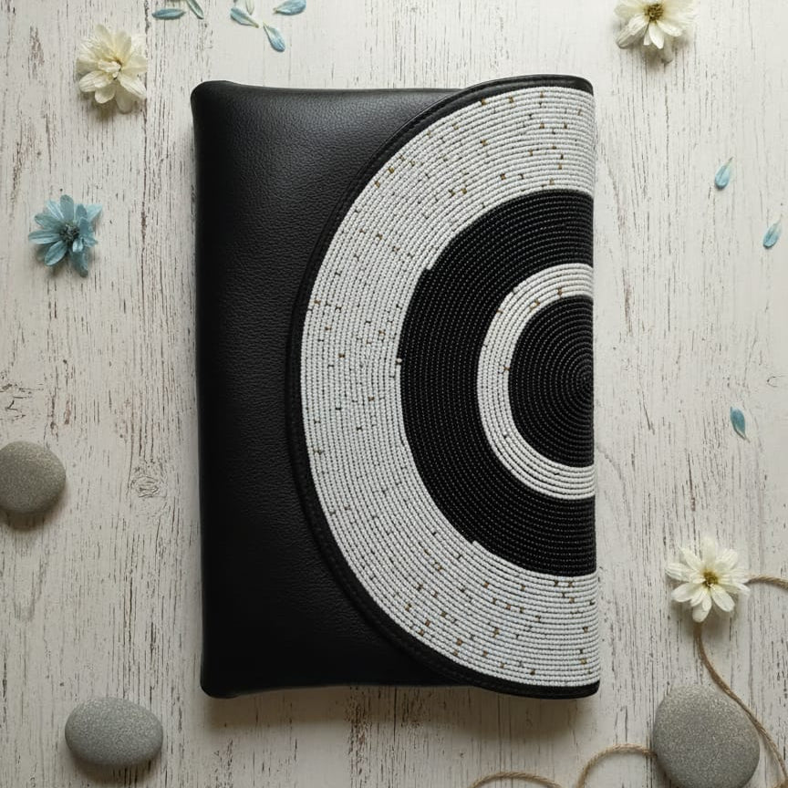 Handcrafted African Glass Bead Vegan Leather Envelope Clutch – Black & White